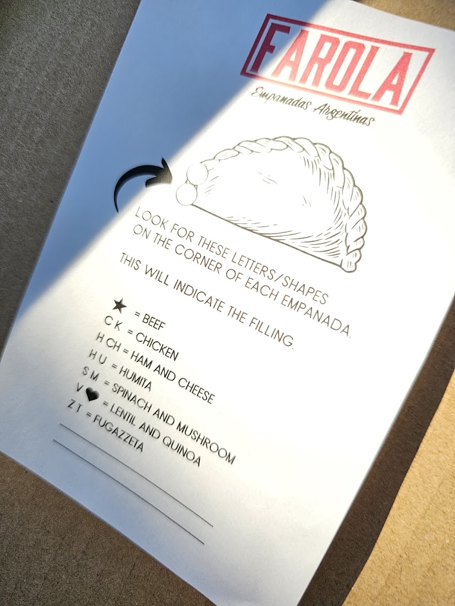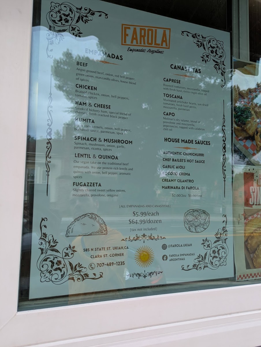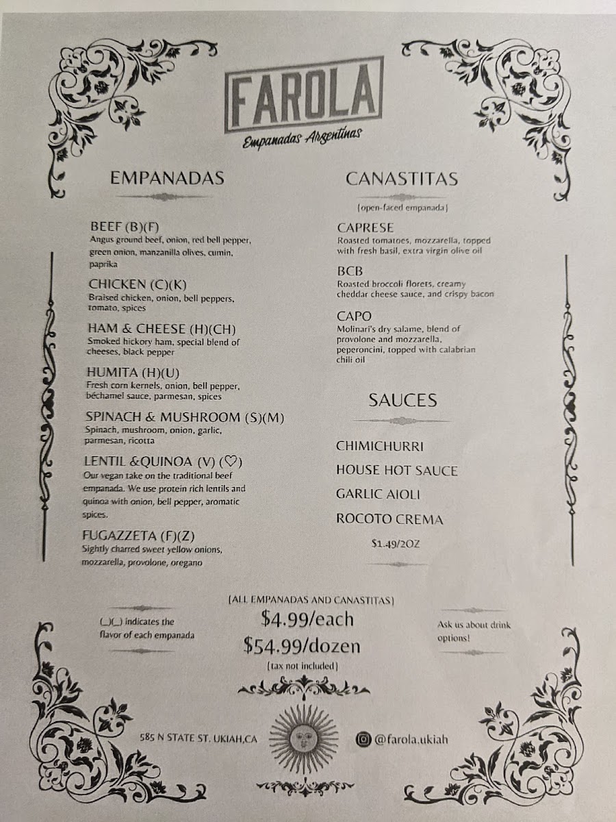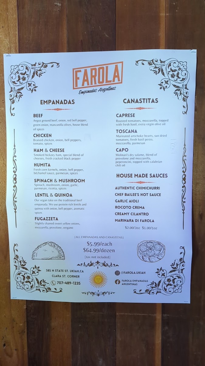 As a reviewer looking back on the menu at Farola Empanadas Argentinas, what stands out most is how thoughtfully curated and well-balanced the selection is, offering both comfort and creativity in every category. The Specials, including the Sausage Gravy Empanada and the Sweet Apple And Dulce De Leche Empanada, perfectly showcase the kitchen’s range-from savory, hearty flavors to indulgent, dessert-like sweetness. The single soup option, Tuscan White Bean And Kale, feels like a deliberate choice: simple, nourishing, and aligned with the rustic, homemade spirit of the restaurant. The core of the menu, of course, lies in the empanadas themselves. Classic options like Beef, Chicken, and Ham And Cheese deliver familiar Argentine flavors, while thoughtful alternatives such as Lentil And Quinoa (Vegan) and Spinach And Mushroom ensure that plant-based diners are equally well served. For something a little different, the Canastitas (Open-faced)-including Caprese, Capo, and Toscana-add variety in both texture and presentation, making the menu feel more dynamic. The “Lost in the Sauce” section, featuring Chimichurri, Chef Bailee's Hot Sauce, Rocoto Crema, Garlic Aioli, and Creamy Cilantro, is a highlight, allowing guests to customize each bite and deepen the flavor experience. For groups or loyal fans, the Dozen Deal: Dozen offers a convenient way to sample widely or stock up on favorites. Finally, the Bottled/Canned Drinks selection-Tejava Unsweetened Tea, Coke (Glass Bottle), San Pelegrino, Yerba Mate, and Water-rounds out the menu with refreshing, no-fuss beverage choices. Overall, the menu feels cohesive, approachable, and satisfying, making it a strong conclusion to any visit and a clear reflection of Farola’s focus on quality, balance, and authentic comfort food.