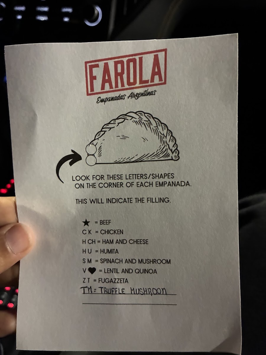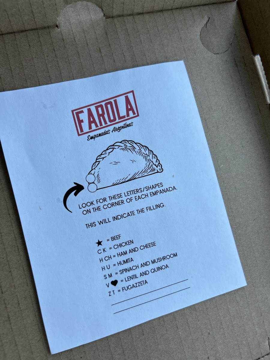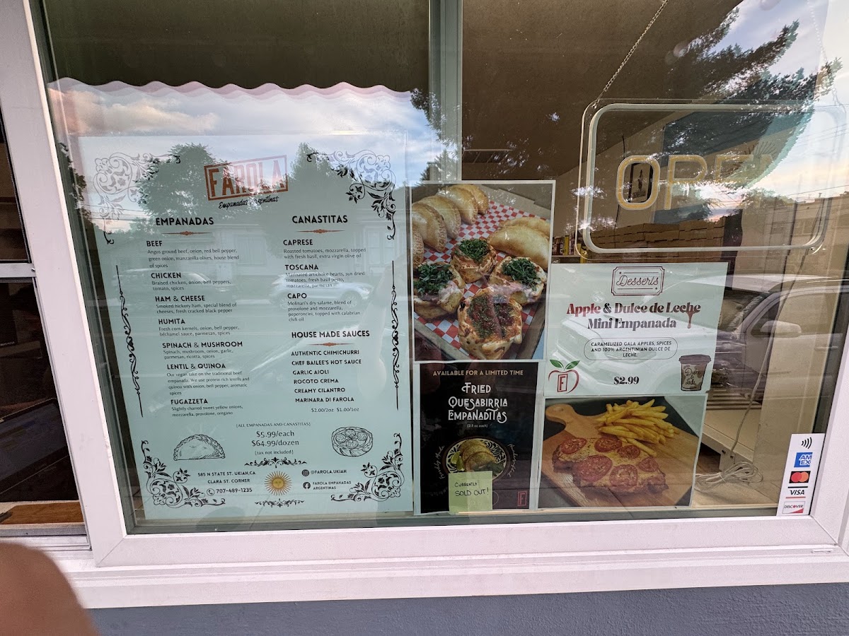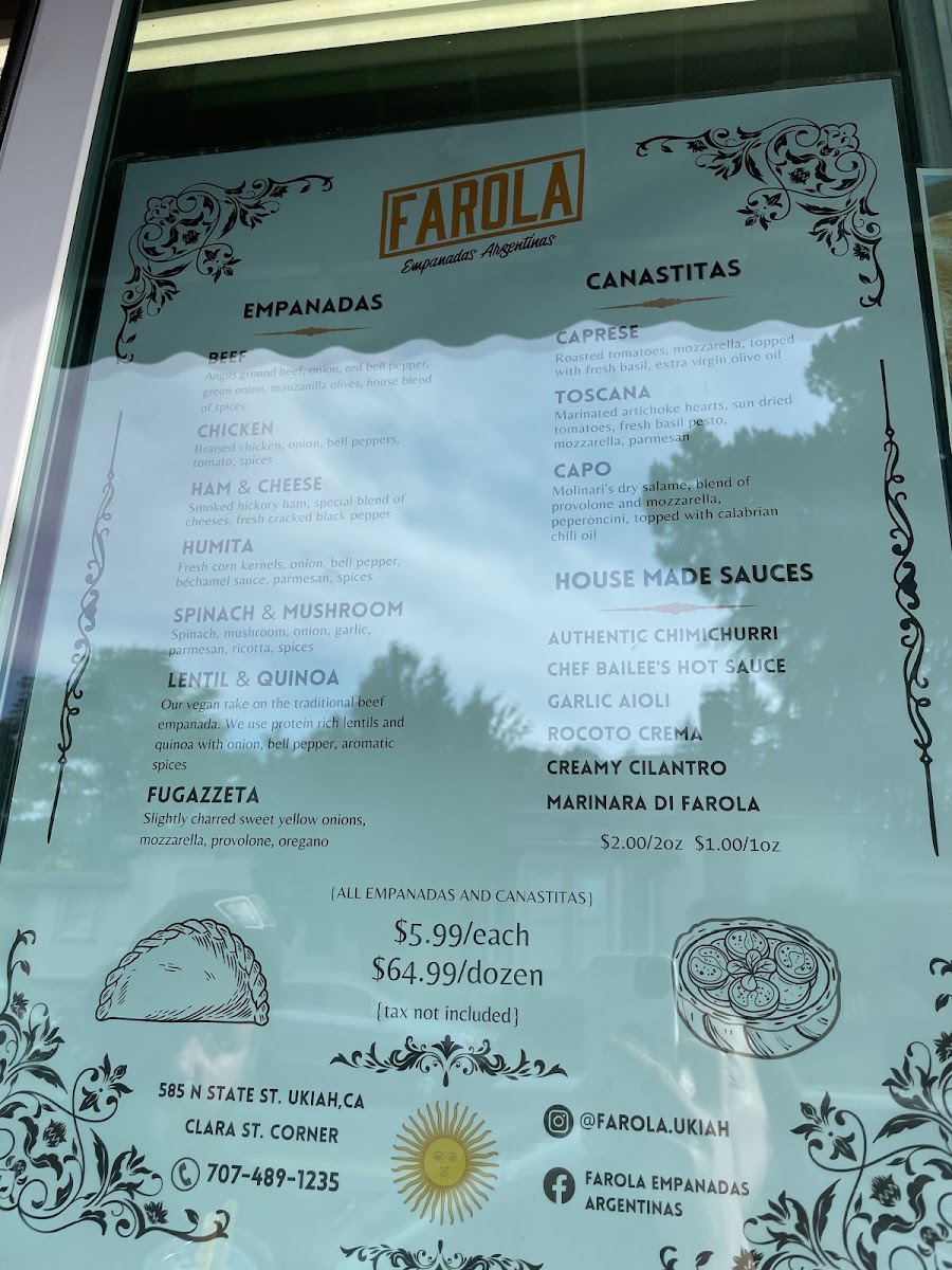 As a reviewer looking back on the menu at Farola Empanadas Argentinas, what stands out most is how thoughtfully curated and well-balanced the selection is, offering both comfort and creativity in every category. The Specials, including the Sausage Gravy Empanada and the Sweet Apple And Dulce De Leche Empanada, perfectly showcase the kitchen’s range-from savory, hearty flavors to indulgent, dessert-like sweetness. The single soup option, Tuscan White Bean And Kale, feels like a deliberate choice: simple, nourishing, and aligned with the rustic, homemade spirit of the restaurant. The core of the menu, of course, lies in the empanadas themselves. Classic options like Beef, Chicken, and Ham And Cheese deliver familiar Argentine flavors, while thoughtful alternatives such as Lentil And Quinoa (Vegan) and Spinach And Mushroom ensure that plant-based diners are equally well served. For something a little different, the Canastitas (Open-faced)-including Caprese, Capo, and Toscana-add variety in both texture and presentation, making the menu feel more dynamic. The “Lost in the Sauce” section, featuring Chimichurri, Chef Bailee's Hot Sauce, Rocoto Crema, Garlic Aioli, and Creamy Cilantro, is a highlight, allowing guests to customize each bite and deepen the flavor experience. For groups or loyal fans, the Dozen Deal: Dozen offers a convenient way to sample widely or stock up on favorites. Finally, the Bottled/Canned Drinks selection-Tejava Unsweetened Tea, Coke (Glass Bottle), San Pelegrino, Yerba Mate, and Water-rounds out the menu with refreshing, no-fuss beverage choices. Overall, the menu feels cohesive, approachable, and satisfying, making it a strong conclusion to any visit and a clear reflection of Farola’s focus on quality, balance, and authentic comfort food.